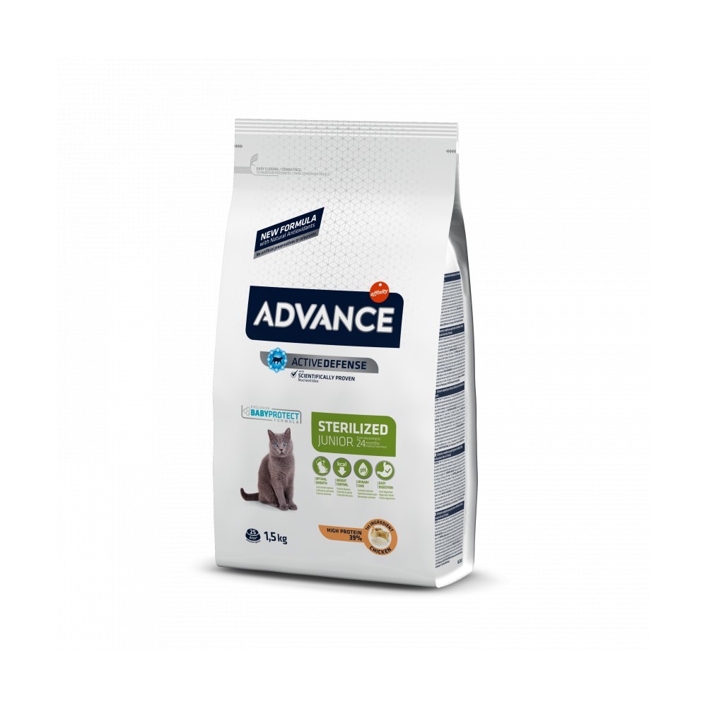 Tras la esterilización, los gatos pueden sufrir cambios en su metabolismo, que pueden causar incremento de peso, menor tolerancia a la glucosa y problemas de tracto urinario. Por eso, es importante cuidar su alimentación con un producto que se adapte a sus necesidades. ADVANCE Sterilized Junior contiene una proporción adecuada de proteínas y de grasas para favorecer el correcto desarrollo de la musculatura al satisfacer las necesidades de proteína de tu gato con la moderación energética necesaria para un gato esterilizado. Además, ayuda a mantener un pH óptimo de la orina y contribuye a su salud intestinal. ADVANCE Junior está especialmente indicado para gatitos esterilizados hasta los 24 meses.